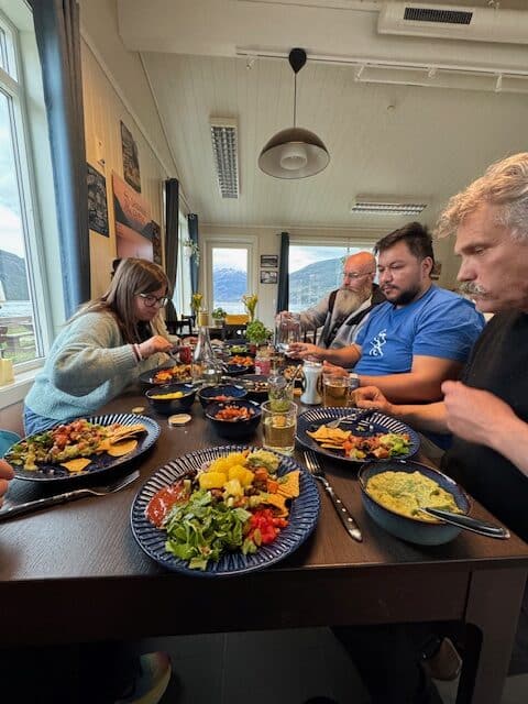 Inne i kafeen har vi plass til 35 gjester, mens vår utendørs paviljong og sittebenker er perfekte for varme sommerdager. Vi brenner for miljøet og helsen din, og har derfor satset stort på smakfulle vegetariske alternativer. Når vi serverer kjøtt, velger vi bærekraftige, norske råvarer – som vår stolthet, «Tinn Taco», laget med lokalt Anguskjøtt fra Eggerud Gard i nabolaget.
